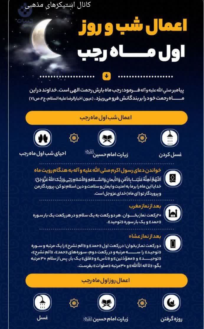 ✅ بر زیارت معصومین به خصوص زیارت امام حسین(ع) در اول و وسط ماه و نیز زیارت امام رضا(ع) در ماه رجب تاکید شده است. و روایات زیادی در فضیلت این ماه از معصومین علیهم السلام وارد شده است.
